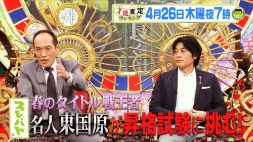 春のタイトル戦「俳桜戦」を制した東国原英夫(名人6段)とフルーツポンチ村上健志が特待生として昇格試験に挑む。