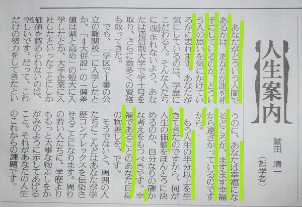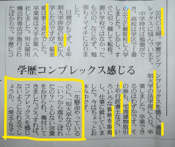 新聞の人生相談:今回は「学歴コンプレックスを感じる主婦」